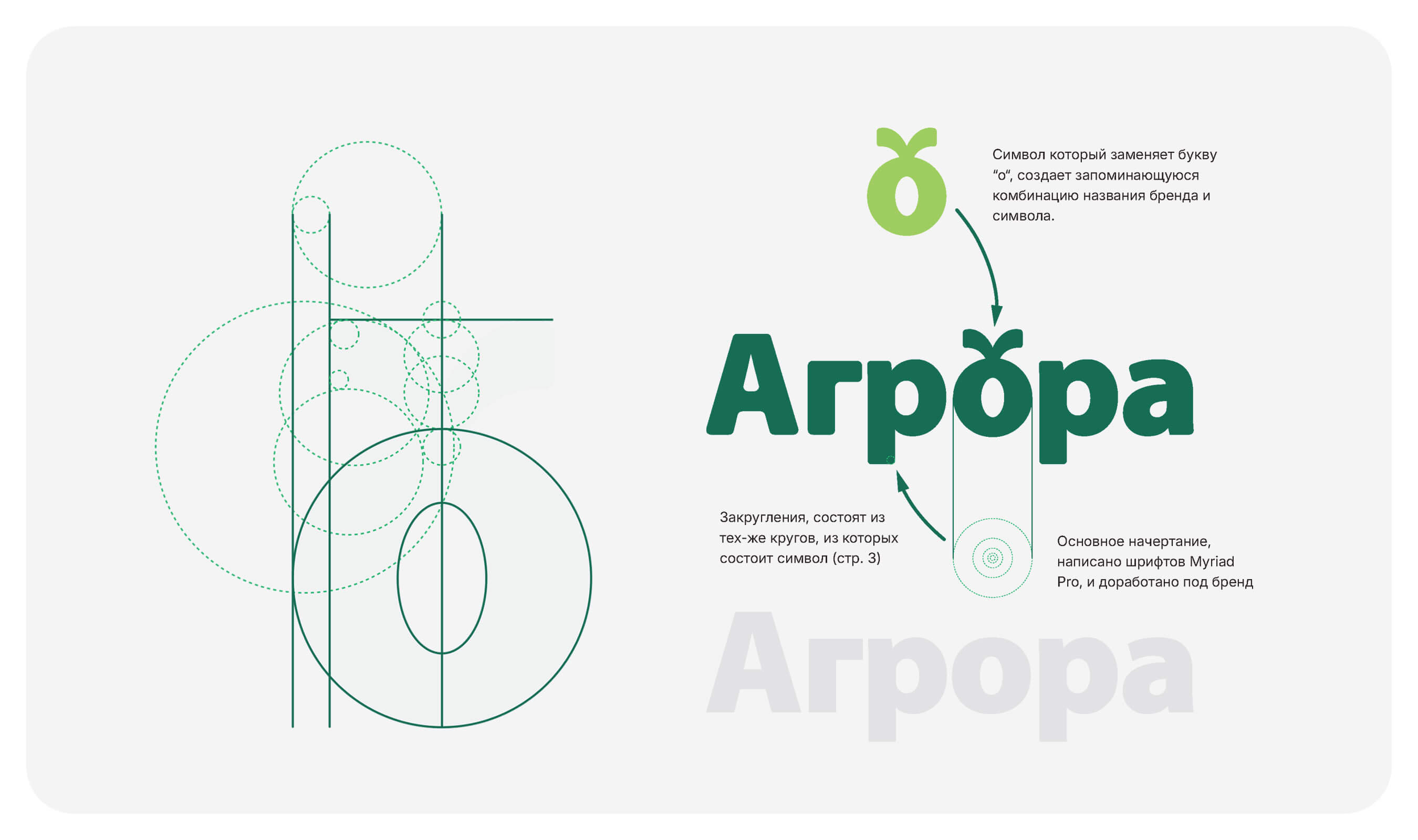 В основе сильного бренда лежит семиотика — язык символов, рожденный уже в самом названии. В случае с «Агрора» центральным элементом стало зерно, пророщенное в букве «О», которое делит имя на две смысловые части, оставаясь сердцем философии бренда — единства природы и развития.